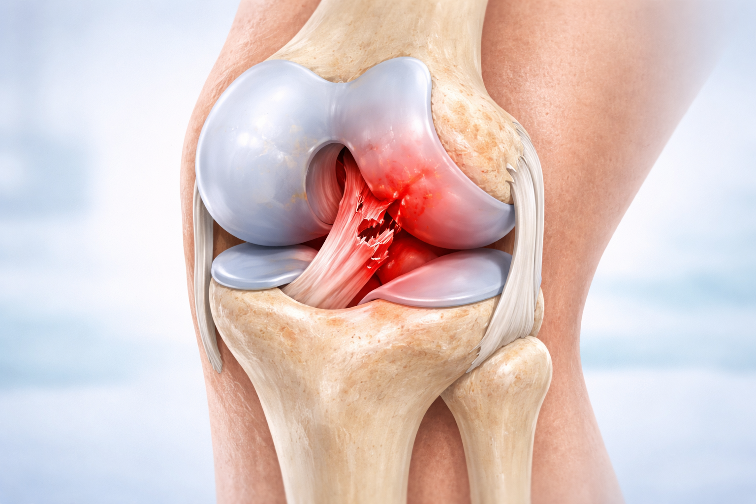 Damage to the knee’s cushioning cartilage causing pain, swelling, and restricted movement.